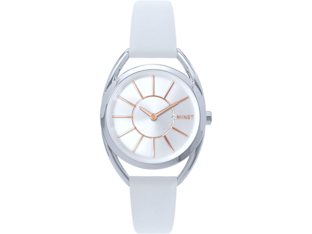MINET Stříbrné dámské hodinky ICON SILVER s bílým koženým řemínkem