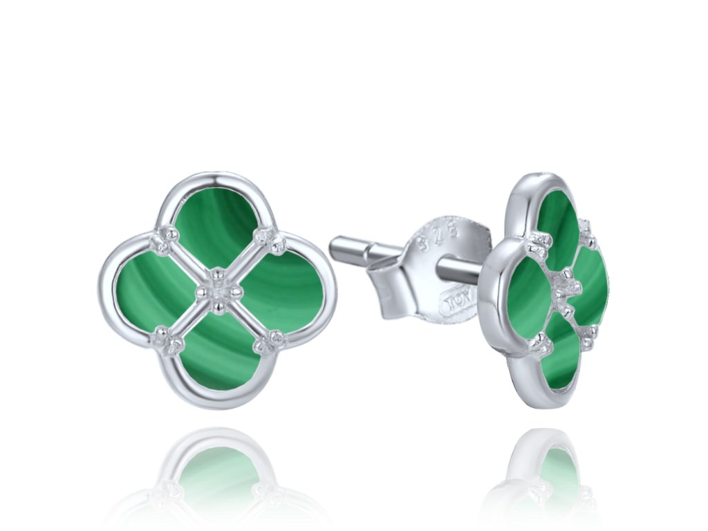 MINET Stříbrné náušnice čtyřlístky s malachitem